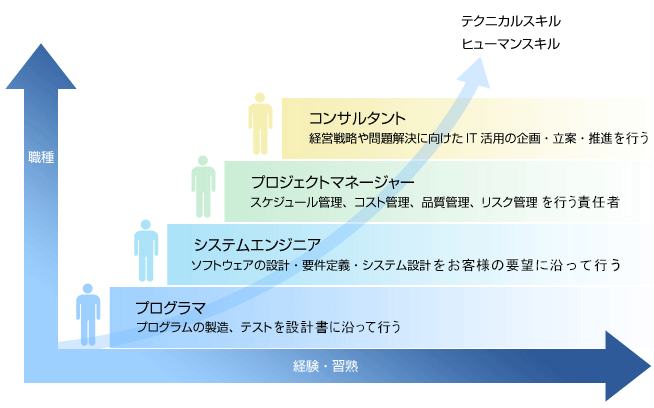 弊社のキャリアプランを紹介いたします。1人1人の適正と成長を考慮し、人材育成を進めております。